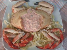Buey de mar con salsa tártara (o algo así).- Mezclar toda la carne del cangrejo con mahonesa, poca, ketchup, menos todavía, como dos cucharadas soperas de cebolleta muy picadita, y otra de alcaparras pequeñas. Se acabó. Ya está. Se presenta más o menos como aquí o como os de la gana. Pero se deja comer y para una cena con amigos, por ejemplo, haces un pescao a la sal, pones esto y dos tonterías más, y quedas como un héroe. El vino y el postre, que lo traigan los invitaos, que te ahorras una pasta. Salut i pesetes, que lo demás son puñetes. Abur